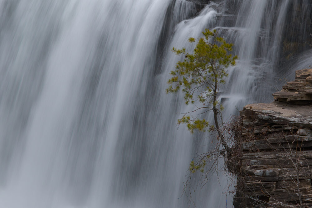 A Lonely Tree, Growing From A Rocky Outcrop With A Backdrop Of A Waterfall, Little River Falls, Alabama