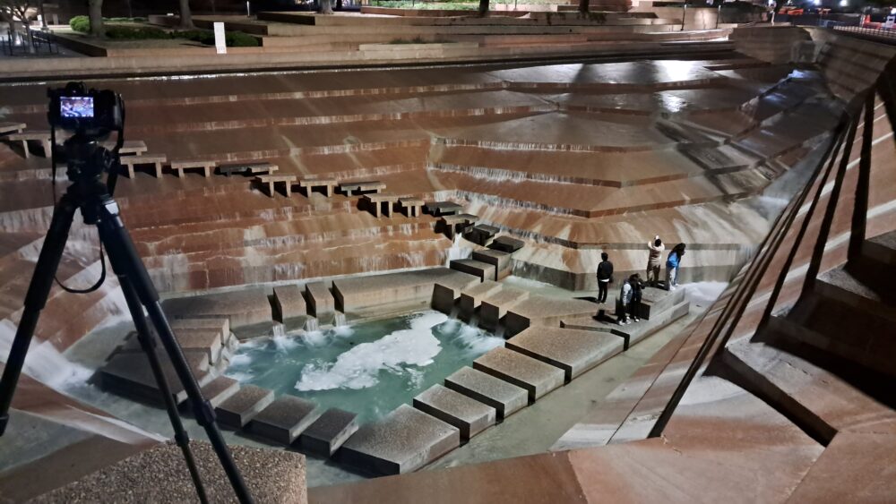 The challenge of urban photography at the Fort Worth Water Gardens, at night, with way more people than we had expected