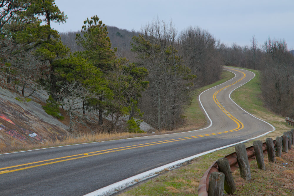 The winding road of Talimena Scenic Drive at Grand View Vista, Arkansas