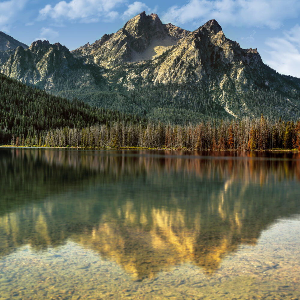 Selective adjustments can enhance colours. Bring out the blues in the sky. Make the greens in the trees richer. Adjust details in the reflection. This makes the image more interesting.